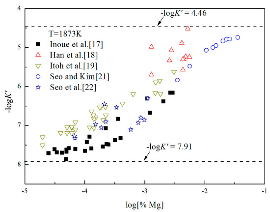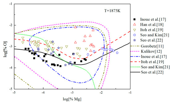 The Mg-deoxidation equilibrium in liquid iron has been investigated by Seo and Kim [21], Itoh et al. [22], and other researchers [17,18,19], and the Mg–O relationships are shown in Figure 8. Han et al. [18] and Seo and Kim [21] held their deoxidation experiments in a closed MgO crucible with initially containing several hundred parts per million oxygen by using Mg vapor. Similar experiments were performed by Itoh et al. [19] in open dolomite crucibles under a mixture atmosphere of argon and hydrogen in a high frequency induction furnace. Seo et al. [22] held their experiments in a specially designed high frequency induction furnace for a strong agitation of melt by adding Ni-Mg alloys. As shown in Figure 8, the equilibrium concentration of [Mg] are fluctuating within the range of 1 × 10−5 < [%Mg] < 0.039 in equilibrium with solid MgO. Moreover, the equilibrium concentration of [O] decreases with the increasing [%Mg] when the equilibrium concentration [%Mg] is <0.001, but the equilibrium concentration of [O] increases with the increasing [%Mg] when the equilibrium concentration [%Mg] is >0.001. In addition, the difference among the equilibrium concentrations of [O] at the same concentration of [Mg] is more than one order of magnitude.