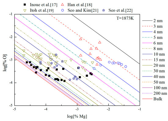 In order to describe the thermodynamic equilibrium rule of Mg-deoxidation in 1873 K, many researchers [11,12,17,19,21,22] gave the different thermodynamic equilibrium curves plotted as lines in Figure 8. It should be noted that the Mg-deoxidation equilibrium relation proposed by Gorobetz et al. [11], Kulikov et al. [12], and Inoue et al. [17] are oval-shaped. This means that one concentration of Mg corresponds to two concentrations of oxygen and vice versa. Moreover, the equilibrium relation of Mg-deoxidation proposed by Seo and Kim [21] is a monotone decreasing function even when the equilibrium concentration of [%Mg] > 0.001. Such a difference between predicted result and measured result in reference [21] comes from an incomplete expression of the activities of dissolved magnesium and oxygen. The equilibrium relations between [Mg] and [O] proposed by Itoh et al. [19] and Seo et al. [22] have a "V" shape. Their equilibrium curves descend with the increasing concentration of [%Mg] and agree well with their equilibrium experiment data when the equilibrium concentration of [%Mg] < 0.001. However, it is impossible to describe all the experiments data by one curve. Jung et al. [46] used the associated solution model to describe the Mg-deoxidation in liquid iron, and suggested that the [Mg] and [O] atoms could not be independently or randomly distributed, but had a strong tendency to form dissolved associated compound Mg–O, etc., as a kind of metastable phase. Thus, it can be suggested that the thermodynamics of Mg-deoxidaiton reaction in liquid iron has a close relationship with that of metastable phase, such as dissolved associated compound Mg-O, nano-MgO, etc.