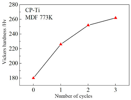 The average Vickers hardness versus the MDF cycles of CP Ti.