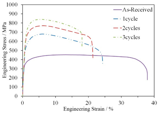 In order to study the tensile performances of UFG materials at room temperature, the engineering stress-strain curves of CP Ti severely deformed by MDF for all cycles were shown in Figure 7.