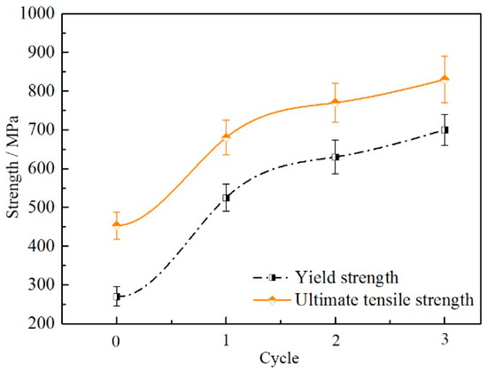 It was found that the strength significantly increased but ductility decreased. This change was obvious from zero cycles to one cycle of MDF, and then the changing trend was slow. Without yield point, yield stress (YS) was determined according to 0.2% criteria deformation. The YS and the ultimate tensile stress (UTS) are depicted in Figure 8.