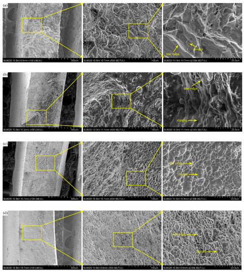 Although the mechanical properties of the CP Ti were improved more significantly by MDF, the fracture toughness was also critical to the resistance of crack initiation and growth. Therefore, the tensile fractured specimens are shown in Figure 9. During tensile tests, some typical fracture phenomena were observed that the fractured location was around the middle of specimen and the crack growth direction was along about 45° of the loading direction. The angle between the fracture surface and tensile axis was an important parameter to estimate modes of material failure [33]. During uniaxial tension, the maximum shear stress happened on a surface with 45° and the sample would fail on this surface if it was weak under shear in this orientation. However, because of other deformation mechanisms, such as twinning, void nucleation and propagation or texture evolution, this could deviate from the value predicted by maximum shear stress, especially for some ductile metals [34]. There was necking behavior in the specimen of as-received CP Ti, but it was not obvious in the specimens of UFG CP Ti, indicating slip dominated plasticity and subsequent damage mode. To further describe the microscopic fracture mechanisms, fractographs are shown as Figure 10.