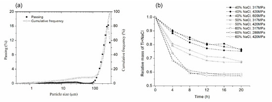 (a) Particle size distribution of NaCl used as a space holder and (b) relative mass loss of Ti+NaCl as a function of dissolution cycles in distilled water at 60 °C.