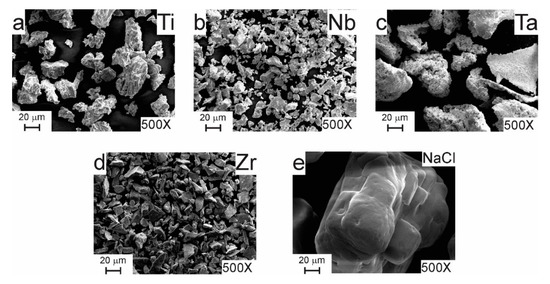 SEM images of as-received (a) Ti, (b) Nb, (c) Ta, (d) Zr, and (e) NaCl powders.