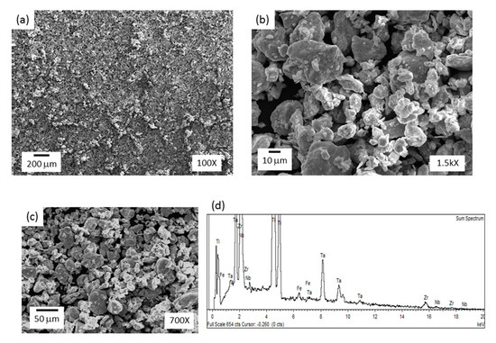 Figure 4a–c shows the morphology of Ti-13Zr-13Ta-3Nb powders after 12 h milling. Figure 4b,c shows the agglomeration of particles with an irregular shape and particle size ranging from 10 to 40 μm. In addition, the edges of the particles were smooth, which indicates that cold welding was more relevant than fracture during mechanical alloying (MA). In addition, particles are repeatedly flattened, cold welded, fractured, and rewelded during the milling process. Kinetics and predominance of cold welding or fracturing at any stage mostly depends on the characteristic deformation of the starting powders [34]. Fe contamination was detected through EDS analysis (Figure 4d). This is expected when steel vials are used in MA.