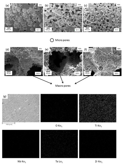 The spatial distribution of foam composition was obtained using the EDS/SEM mapping method. Figure 5g revealed that Ti, Nb, Ta, and Zr are spread homogeneously within the sample with 60% porosity. The same compositional trend was observed in the foams with 40 and 50% porosity. Also, the presence of oxygen was detected within foams, probably connected to the high chemical affinity with oxygen of all elements present in foams, which led to oxide formation due to their low equilibrium partial pressure of oxygen.