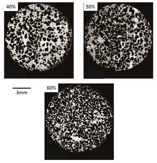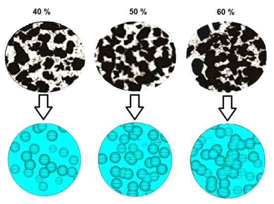 Diverse theoretical models, such as Knused-Spriggs [39,40], Gibson and Ashby [41], Phani and Niyogi [42], Pabst and Gregorová [43], and Nielsen [44] can be used to predict the elastic modulus of metallic foams. The equations and constant values related to each model are listed in Table 1. Interpretation of each constant can be obtained from the corresponding references. These models were used in this study because they have been reported to provide E values close to the corresponding experimental measurements done in pure Ti [38] and Ti-6Al-4V [45]. Estimated E values were compared to the ones obtained using FEA. The accuracy of FEA estimations, compared to the experimental values, is connected to the proximity of the models to the real foam topologies. Figure 8 shows that the morphologies of real (upper images) and modeled (lower images) pore networks are very similar for each porosity percentage, suggesting the effectiveness of the method used for modeling foams. The presence of abundant pores interconnection was modeled as well, in agreement with features observed in SEM images. Interconnection is a significant factor for improving the prediction capabilities of FEA. Low interconnection in FEA models with a regular distribution is one of the most important causes of over predicting the Young’s moduli.