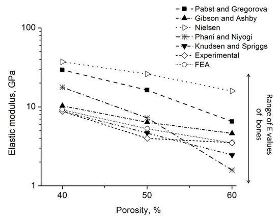 Figure 9 shows the E values estimated using theoretical models (Table 1), the E values obtained using FEA, and those experimentally measured in this work. The constant values, taken from the work of Zhu et al. [45], are listed in Table 1. In that report, E values of metallic foams with various porosities were determined using an electromagnetic acoustic resonance experiment. Such model and experimental data showed that the elastic modulus decreases when porosity increases. In our work, the Knudsen-Spriggs and Gibson-Ashby models provided E values close to experimental data (between 3 to 10 GPa). The Pabst-Gregorova, Nielsen, and Phani-Niyogi models exhibit higher E values compared with experimental data. All foams showed elastic modulus values in the range of cortical bones [46], which is a clear indication of their potential for biomaterial applications. It can be clearly observed that the FEA model estimations are very close to the experimental results, obtaining low errors compared to other used estimations. This result shows that FEA is an important tool for the study of foams, predicting their compressive behavior in an accurate way. The selection of the foam topology has been demonstrated to be an essential variable for obtaining a correct estimation without overpredicting foam strength, and many other models did not take into account pores’ interconnection.
