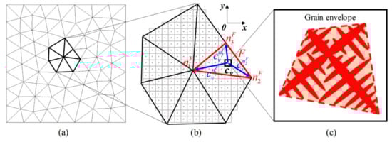 The CAFE model is based on a macroscopic FE model and a microscopic CA model, and a coupling between them is implemented. Figure 1 schematizes different length scales and their relationship included in this model. The macroscopic scale is represented by an FE grid of triangular elements, where macroscopic conservation equations of mass, momentum, energy, and solute are solved (Figure 1a). The microscopic scale is expressed by a CA grid of square cells (Figure 1b), in which the development of the grain structure is described. Neglecting the dendrite morphology, each grain is simplified by an envelope outlining the dendrite tip positions (Figure 1c). For cubic crystalline materials, the grain envelope is characterized by a quadrilateral shape in 2D case and an octahedral shape in 3D case. Only the nucleation and growth of the primary solid phase is considered, and the grain boundary wetting [24,25] is ignored.