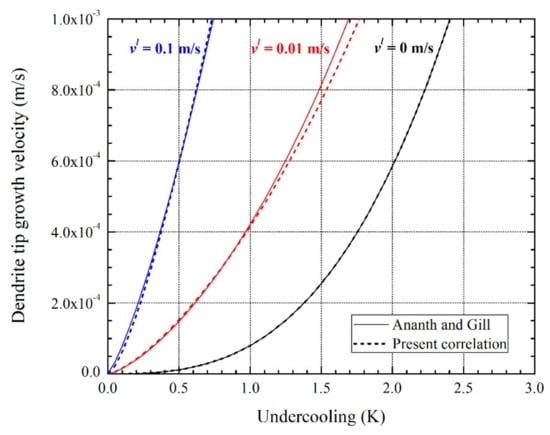 Variations of the dendrite tip growth velocity of Sn–3wt%Pb alloy with the undercooling for different values of the fluid flow velocity ().