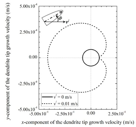 Polar plot of the dendrite tip growth velocity of Sn–3wt%Pb alloy with K as a function of the angle between the preferential orientations and the liquid velocity vector in the presence and absence of fluid flow.