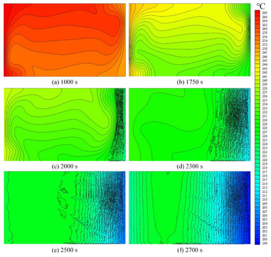 The temperature and solid fraction fields obtained by the present CAFE model are illustrated in this section. Figure 6 shows the temperature distributions at selected instants. At 1000 s (Figure 6a), that is, the end time of stage (2) for the stabilization of the temperature and fluid flow fields, the isotherms present a stratified core at the center and vertical layers near the LHS and RHS walls. In the stratified core, the temperature increases with the increasing height, indicating a clockwise circulation of the fluid flow because of high temperature on the LHS wall. With both the LHS and RHS heat exchangers cooling down since 1000 s, the stratification characteristic of the isotherms is maintained until 1750 s (Figure 6b), when a solidification front starts to develop from the RHS wall to the left. With the solidification front developing, the isotherms in the right half and those in the left half become denser and sparser, respectively, which indicates a large temperature gradient in the mushy zone and a small one in the liquid zone, respectively, as shown in Figure 6c,d. Due to the instability of the growth front, the isotherms near the RHS wall are less smooth. At 2500 s (Figure 6e), the number of the isotherms in the left half of the ingot is very few, and the highest temperature appears at the position about a third of the length to the LHS wall, indicating that another solidification front will develop from the LHS wall to the right. Upon further cooling, the isotherms in the left part of the ingot become denser gradually and merge with the isotherms in the right part of the ingot finally at the position about a third of the length to the LHS wall, as shown in Figure 6f.
