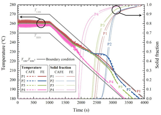 In order to give a closer insight into the solidification process, the cooling curves and the solid fraction evolutions obtained by the present CAFE model at the four locations P1–P4 (shown in Figure 2) are compared with those given by the FE simulation, as shown in Figure 8. In both simulations, the solidification starts in the sequence of P4, P3, P1, and P2, and finishes in the sequence of P4, P3, P2, and P1. For the cooling curves, little difference is shown between the two simulations. The cooling curve at each location shows a great oscillation when it is in liquid state, which indicates a significant oscillation in the fluid flow. For the solid fraction evolutions, however, the results predicted by the present CAFE model at all the four locations P1–P4 obviously fall behind those given by the FE simulation, and a little more liquid undergoes the eutectic transformation finally.
