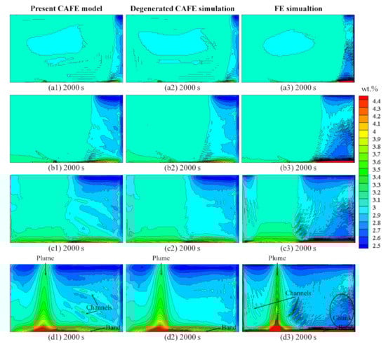 The segregations maps obtained by the present CAFE model, the degenerated CAFE simulation disabling the effect of the fluid flow on the dendrite tip growth kinetics, and the FE simulation disabling the CA model at selected instants are compared in Figure 10. It is demonstrated that the segregation maps are generally consistent. Once the first solidification front is initiated on the RHS wall, a negative segregation pocket and a positive segregation band develop from the RHS wall to the left at the top and bottom part of the ingot, respectively, as shown in Figure 10a1–b1,a2–b2,a3–b3. Since the initialization of the second solidification front on the LHS wall, another negative segregation pocket and another positive band develop toward the right at the top and bottom part of the ingot, respectively, as shown in Figure 10c1–d1,c2–d2,c3–d3. The two negative segregation pockets and the two positive segregation bands both impinge at the position about a third of the length to the LHS wall, forming a vertical Pb-rich plume, as shown in Figure 10d1,d2,d3. Quantitatively, significant differences can be concluded in two aspects. Firstly, comparing the segregation maps obtained by the present CAFE model (Figure 10a1–d1) with those given by the FE simulation (Figure 10a3–d3), the segregation maps obtained by the present CAFE model show a lower positive segregation band along the bottom wall, and the segregated channels beside the plume and the negative segregation chunk predicted by the FE simulation at the lower right corner are not found. Secondly, comparing the segregation maps obtained by the present CAFE model (Figure 10a1–d1) with those given by the degenerated CAFE simulation (Figure 10a2–d2), more obvious segregated channels almost aligned with the orientations of the columnar grains are predicted by the present CAFE model in the right of the plume, which is attributed to the introduction of the fluid flow in the calculation of dendrite tip growth kinetics.