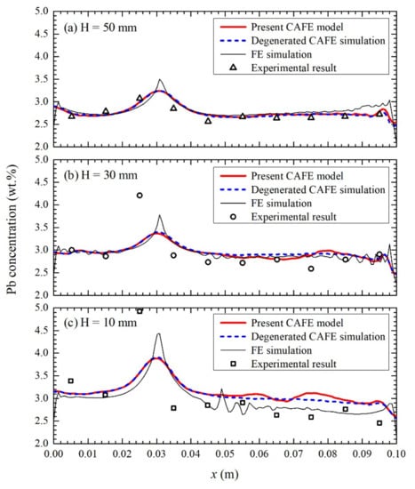 Comparisons of the final average mass concentration of Pb obtained by the present CAFE model, a degenerated CAFE simulation disabling the effect of the fluid flow on the dendrite tip growth kinetics, and a purely macroscopic FE simulation disabling the CA model with the experimental measurements [22] along the three horizontal lines L1–L3 at the heights of 10 mm, 30 mm, and 50 mm in the ingots (Figure 2).