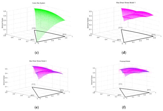 Schmid factors and modified factor: (a) primary octahedral slip system; (b) secondary octahedral slip system; (c) cubic slip system; (d) all three slip systems; (e) primary octahedral slip system and cubic system; and (f) modified factor.