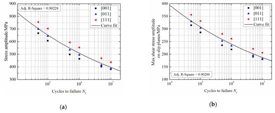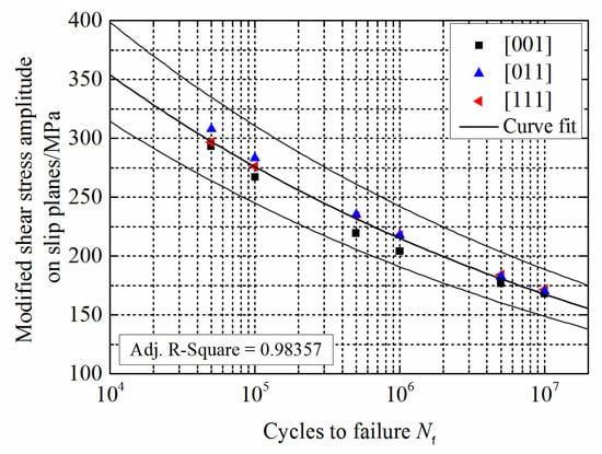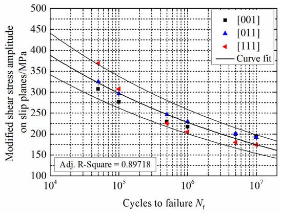 High cyclic fatigue data for DD6 material at 700 °C was selected for analysis []. The experiments were carried out according to the loading directions of [001], [011], and [111], with a stress ratio of −1. The results are shown in Figure 2 and Figure 3.