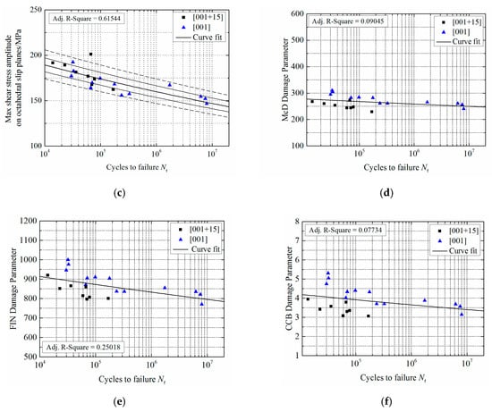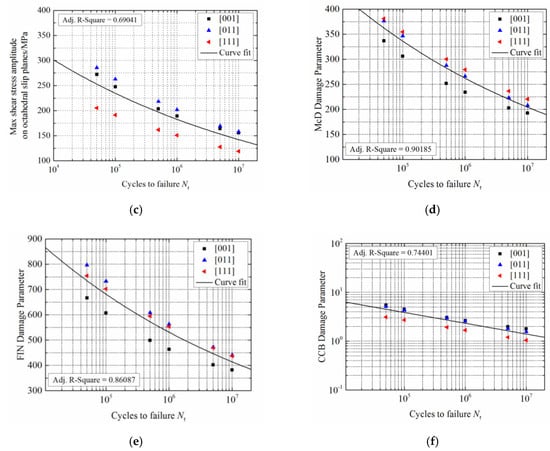 Fatigue life predictions for DD6 material at 700 °C: (a) stress amplitude; (b) maximum resolved shear stress amplitude; (c) maximum resolved shear stress amplitude (primary octahedral slip system); (d) McD model; (e) Fin model; (f) CCB model.