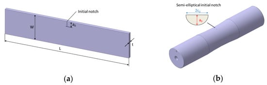 (a) Illustration of the investigated single edge notch bending (SENB) specimen with straight initial notch and (b) 1:3-scaled axle specimen with semi-elliptical initial notch.