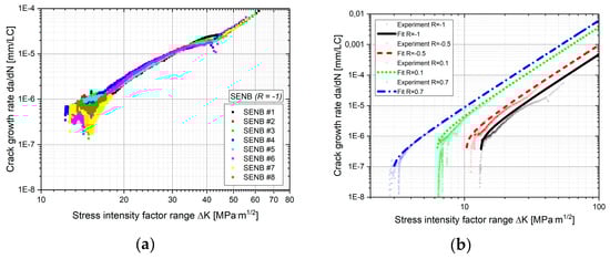 Experimental crack growth diagrams of SENB samples; (a) test data of eight specimens at a stress ratio R = −1; (b) Comparison of results and fit for different stress ratios from R = −1 to R = 0.7.