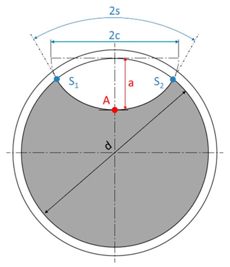 Round bar specimens with a testing diameter d = 55 mm (scale of 1:3 to a real railway axle) have been tested in a rotating bending test rig. The geometry of the samples is depicted in Figure 3b and detailed information on the manufacturing procedure is given in []. The nomenclature of the semi-elliptical crack front is illustrated in Figure 5. The crack length on the surface of the specimen is observed by an in-situ optical measurement system. Crack propagation tests are performed starting with surface crack lengths between 2s = 4 to 5 mm up to a final value of about 2s = 18 mm, which corresponds to the limit of the optical measurement system. Detailed information about the optical crack length acquisition system and calibration is given in []. A geometrical recalculation of the projected surface crack length (shortest distance between S1 and S2) to the real surface arc crack length 2s is performed in order to properly evaluate the crack growth behavior.