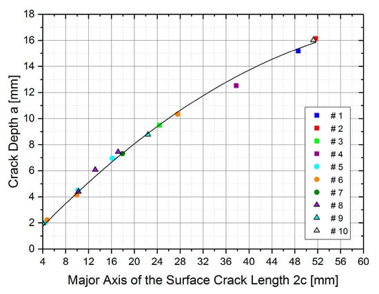 After testing, all samples are cooled down in liquid nitrogen atmosphere and fractured. Optical microscopical analyses of the fracture surfaces are conducted to evaluate the crack shape evolution of the semi-elliptical crack front. To this purpose, a self-written software code is established to measure the semi-elliptical crack front evolution at the fracture surfaces. Starting from the initial notch, beach marks and the final fracture surface are evaluated by non-linear least-squares curve fitting so that the axes of the semi-elliptical crack front can be determined. The data points of the investigated specimens provide information of crack depth evolution depending on the surface crack length (a = f(2s) and a = f(2c) respectively). In Figure 6, the evolution of the crack shape a = f(2c) for 10 tested round bar specimens is depicted. The variation of the shape between the different specimens is small, hence a single fitting function has been determined.