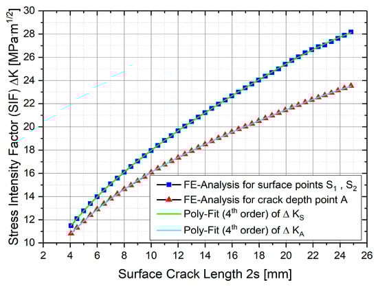 The J-Integral leads to inaccurate results for contour integral evaluation on free surfaces (at the end of the crack front) due to the boundary layer effect [,]. This means that the 1/√r-singularity of the stress field on the surface domain is not fulfilled. To this purpose, the SIF-values from contour integrals below the surface are fitted and extrapolated to the surface in order to properly evaluate the stress intensity factor ΔKS at the surface points S1 and S2, which majorly influence the crack growth behavior. In the case of linear elastic fracture mechanics, the J-Integral is equivalent to the strain energy release rate G and the stress intensity factor KI can be determined according to Equation (7),