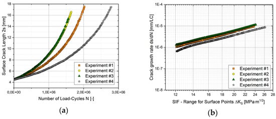 Although all experiments show similar slopes and minor shift of the different curves in the Paris region (see Figure 9), a maximum deviation of 1.65 at residual lifetime between Experiment #3 and #4 was observed (evaluated at a surface crack length 2s = 15 mm).
