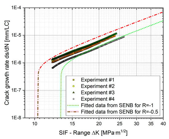 The comparison of fitted data points from SENB specimens and round bar specimens is depicted in Figure 10 and shows that the crack growth curves of the round bar samples are in the range of SENB specimens between load ratios R = −1 and R = −0.5. Although all round bar specimens are tested at R = −1, a shift of the crack growth curves can be observed.