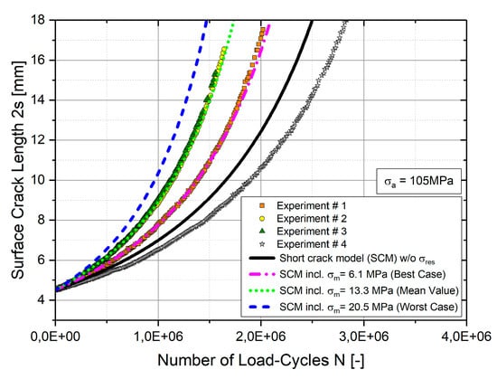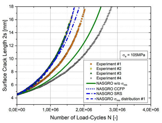 First, crack growth calculations without any consideration of residual stresses have been performed. The results highlight that the estimation is satisfying for experiment #4, but non-conservative for the results of experiments #1–#3. Consequently, the averaged results of residual stress measurement #1, see Table 2, are considered as a mean stress state in the analysis. The consideration of such mean stresses leads to a variation of the local load ratio and thus changes the crack growth rate. The results without and with consideration of residual stresses are depicted in Figure 11 in comparison to the experiments.