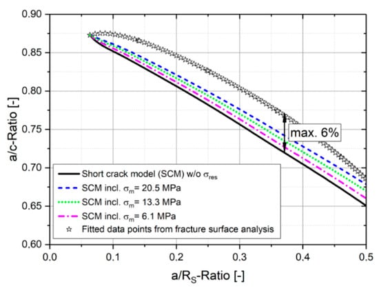 Although the residual stresses considered are quite small, the influence on the residual lifetime is shown to be significant. Here, a mean stress of σm = 6.1 MPa for the best case situation shows a reduction of 16% estimated residual lifetime at a final surface crack length of 2s = 18 mm. For comparison, in the worst case with σm = 20.5 MPa mean stress, the residual lifetime is even 41% lower. Although the assumption of average constant residual stresses as a mean stress state is an approximation, the results of the evaluated residual lifetime in Figure 11 show sound accordance with the experiments. The analytically estimated crack shape evolution of the semi-elliptical crack front compared to the fitted data points of the fracture surface analysis is depicted in Figure 12. The comparison exhibits some deviation of the crack shape evolution, whereas the experiments show a pronounced parabolic shape evolution after crack initiation, the calculations exhibit a less pronounced development. However, a maximum deviation of only 6% between the fracture surface analysis and the assessment without any residual stress consideration is observed at an a/RS-ratio of about 0.37.