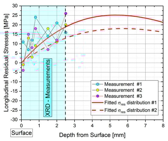 As mentioned, residual stresses are measured up to a maximum depth of 2.5 mm by X-ray diffraction (XRD). For depths below, no further information is available due to measurement limitations. Based on the measured data points, residual stress distributions up to a depth of 12 mm are extrapolated to achieve an improved crack shape evolution in the course of the crack growth calculations.