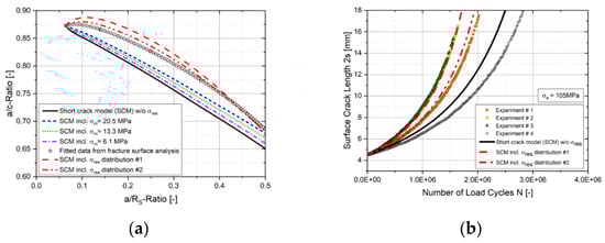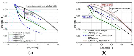 Figure 16b illustrates the crack shape evolutions of the analytical and numerical assessments with and without the consideration of the residual stress distribution compared to the experimental investigations. For both assessment methods, an improved estimation of the crack shape evolution is achieved.