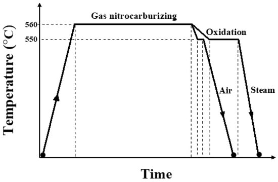 As shown in Figure 1 and Table 2, oxi-nitrocarburizing was performed in two steps: Gas nitrocarburizing was performed at 560 °C as the first step, and oxidation was performed at 550 °C as the second step. Gas nitrocarburizing was carried out for 100 min in an ammonia (NH3), nitrogen (N2), and carbon dioxide (CO2) atmosphere, and the purity of the gases was more than 99%. After gas nitrocarburizing, oxidation was performed in air atmosphere for 5 min for the air-specimen. In contrast, for the steam-specimen, oxidation was performed in a high temperature steam (H2O) atmosphere for 30 min. About 50 min was needed to reach the gas nitrocarburizing temperature of 560 °C, which is the temperature of the first step. After oxidation in the second step, nitrogen was injected into the chamber and cooled to approximately 100 °C to complete the oxi-nitrocarburizing process.