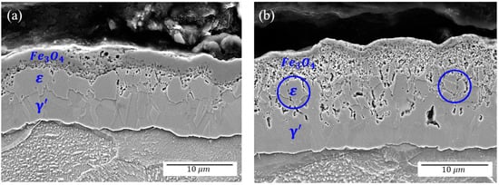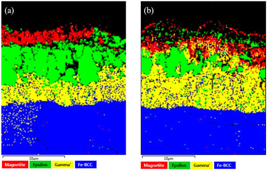 Figure 2a,b shows cross-sectional SEM images of the air-specimen and steam-specimen. As shown in Table 1, the raw material used in this study is extremely low-carbon steel with a C content of 0.0018 wt.%. Therefore, the surface hardened layer formed by gas nitrocarburizing of the specimens used in this study is similar to that of other studies, in that a surface hardened layer is composed of a porous ε-phase, massive ε-phase, and γ′-phase processed by gas nitrocarburizing low-carbon steels [,]. Based on the SEM image shown in Figure 2, the EPMA and EBSD study were performed from a microstructural view point including phase and metallic element distribution.