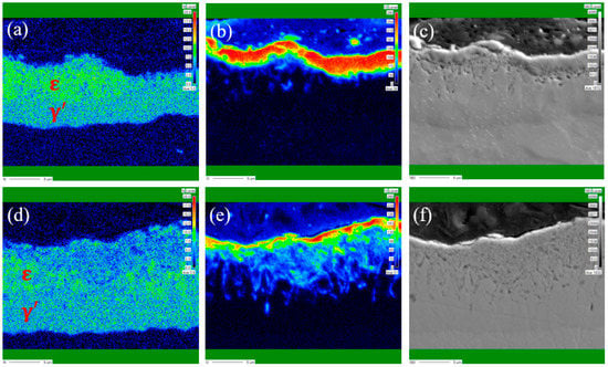 As shown in the nitrogen elemental maps in Figure 3a,d, the compound layer exists as two phases (ε, γ′) with different nitrogen contents. The region with relatively high nitrogen content is the ε-phase(Fe2–3N) and the region with low nitrogen content is the γ′-phase(Fe4N) [,]. The air-specimen has a compound layer with a mean thickness of 8 μm, which is composed of a massive, continuous ε-phase and γ′-phase. On the other hand, the steam-specimen revealed a compound layer with a thickness of approximately 11 μm, in which relatively small and isolated grains of ε-phase existed in the γ′-phase. Generally, the oxidation process provided an annealing effect on the compound layer, which caused the ε-phase to decompose to the γ′-phase and the nitrogen to redistribute [,,]. Through the redistribution of nitrogen during the oxidation step, the γ′-phase grew and the thickness of the compound layer of the steam-specimen increased. In this manner, the volume fraction of the ε-phase in the compound layer decreased for the steam-specimen [,].