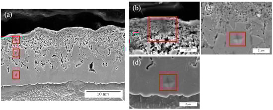 Figure 3b,e shows elemental maps of oxygen for each specimen. In the air-specimen, most of the oxygen was concentrated on the surface layer in the range of 2 μm. On the other hand, the distribution of oxygen in the steam-specimen was deeply spread from the surface with a range of 3–5 μm. From the SEM images in Figure 3c,f, a porous microstructure is clearly observed in the surface hardened layer.