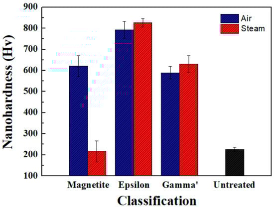 A qualitative comparison of the nanohardness of the air-specimen and steam-specimen showed that the nanohardness of the ε-phase and γ′-phase constituting the compound layer had a similar tendency, but the nanohardness of the steam-specimen showed higher than that of the air-specimen. This is because the nitrogen concentration in the ε-phase and γ′-phase increased due to the annealing effect imparted by the oxidation process [,]. That is, the nitrogen concentration in the ε-phase and γ′-phase increased as the oxidation process proceeded, which made the nanohardness of the compound layer increase.