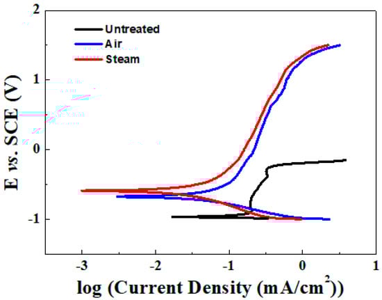 Figure 8 shows the representative results of the potentiodynamic polarization test for three different specimens. The polarization curves of the air-specimen and the steam-specimen were shifted to a higher potential and lower current density direction than those of the untreated-specimen.