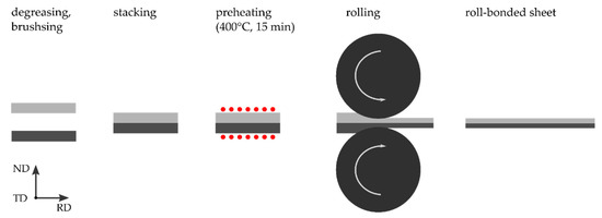 Figure 1 illustrates the applied roll-bonding process. To achieve good bonding, it is essential to create a fresh surface without contaminations in the bonding area. The surfaces of TRIP and TWIP steels were therefore degreased with acetone and brushed in order to remove both the present oxide layer and contaminations from the surface. Besides the cleaning, brushing creates a work-hardened layer [18,27]. The steel brush had wires with a diameter of 0.35 mm and the rotation speed was 1658 rpm (rounds per minute).
