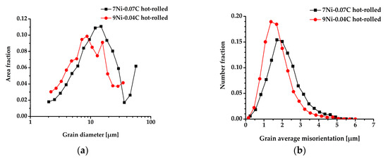 Distribution of grain sizes (a) and grain average misorientations (b) of 7Ni-0.07C (7%Ni) and 9Ni-0.04C (9%Ni) in the hot-rolled state.