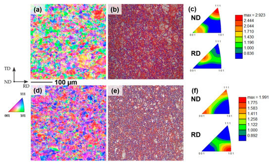 Figure 3 and Figure 4 summarize results of the microstructure of the hot-rolled states obtained by EBSD measurements including grain size distributions (Figure 3a), average grain mis-orientations (Figure 3b), crystallographic orientation maps (Figure 4a,d), grain boundary maps (Figure 4b,e), and texture (Figure 4c,f) for both steel variants.