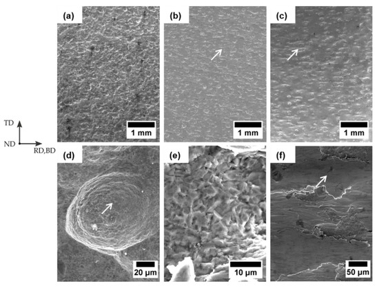 Furthermore, a pockmarked surface shape with microvoids the form of spherical “dimples” can be seen both in the grooves and outsides (Figure 5d and Figure 6d, marked with arrows), which are comparable to dimples on a ductile fracture surface [62].
