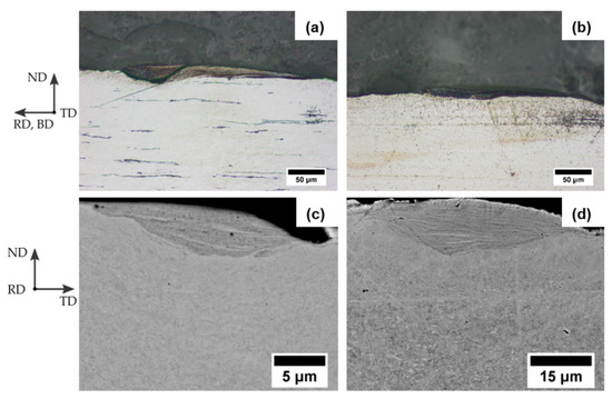 Areas with a severely deformed microstructure, such as that reported in Reference [28], were found both in longitudinal and transversal plane for both steels. The shape of these deformed areas is either elongated parallel to the brush direction (BD) or lentil-like in longitudinal plane and transversal plane, respectively. These severely deformed areas exhibit a stronger etching attack and appear, therefore, in a darker contrast. Significantly higher amount of severely deformed areas were found after the two-step brush process compared to the single-step one, which corresponds to the pronounced appearance of risings after the two-step brush process (cf. Figure 5 and Figure 6). Additionally, a concentration of oxygen in this area was determined through EDX analyses. According to Bay [14], these areas created by the rotating brush wires consist of severely deformed base material together with oxides from the removed oxide layer and form a brittle work-hardened cover layer.