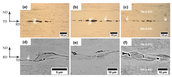Figure 8 shows optical and SEM micrographs of the bonding zone of the roll-bonded mono materials and the composite sheet in the longitudinal and transversal plane. Micrographs of the bonding zone were similar between the roll-bonded sheets and show that the bonding zone includes in all cases in homogeneities such as oxides of the fractured brittle work-hardened cover layer. This bonding zone with oxides is similar to that presented in References [8,14,37,65]. Due to a different formability and higher hardness of the oxides in comparison to the steel, the steel has deformed around the oxides during deformation, as reported in Reference [37] (Figure 8a,c). In addition, Figure 8a,c illustrates a shear fracture under 45° of the brittle cover layer (marked with arrows) and their fragments are lying along a straight line, as reported in Reference [14]. Defects in the bonding zone are considered to affect the bonding strength [8,25,26,65,66,67]. Furthermore, partial separation between the layers is visible (Figure 8c,d, marked with arrows). Therefore, the majority of the bonding zone did not show a complete coalescence. Only a minor part of the bonding zone mostly between the fragments reveals a good interconnection of the material in the bonding zone [25] (Figure 8b, marked with an arrow). SEM micrographs (Figure 8d,f) show the bonding zone at higher magnification. Other defects, such as voids or cracks, are clearly visible. Voids can be attributed to the grooves after hot rolling, which remained after brushing (Figure 8e), as well as due to the fracture of the brittle cover layer (Figure 8f). Cracks were mostly found within the work-hardened cover layer (Figure 8e,f).
