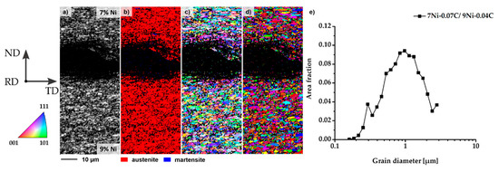 Furthermore, a significantly smaller grain size is visible near the bonding zone compared to regions far from it (Figure 8f). It is due to the excessive shear in the bonding zone during roll bonding. This becomes even more obvious from EBSD measurements performed on the bi-material composite of steels 7Ni-0.07C and 9Ni-0.04C shown in Figure 9.