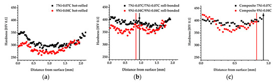 The hardness of the sheets increased after roll bonding due to the additional shear and compression strain. Also in this state, a higher hardness of 7Ni-0.07C was determined from the mono material sheets. Moreover, a parabolic hardness distribution profile along the sheet thickness was noticed. Hence, both the hardness at the surface and at the bonding zone of the sheet are higher than in the middle of the sheet with an equivalent distance to the bonding zone and the sheet surface. Besides the local higher shear strain in the surface and bonding zone, also the strain field around the oxide particles in the bonding zone (Figure 8) could have contributed to the higher local hardness [34]. A comparable hardness of the 9Ni-0.04C and 7Ni-0.07C sheets was estimated from the roll-bonded composite. This is attributed to a higher degree of deformation of the 9Ni-0.04C sheet in the composite after roll bonding due to the lower hardness after hot rolling in comparison with 7Ni-0.07C (Figure 10a), which resulted in a higher hardening degree, especially near the sheet surface (Figure 10c).