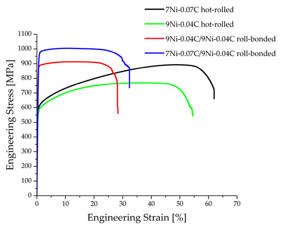 Engineering stress-engineering strain curves for hot-rolled and roll-bonded steel specimens.
