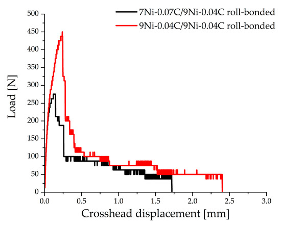 Figure 12 shows the load vs. displacement curves of the roll-bonded sheets from the T-peel tests. It can be seen that both the maximum and average peel strength from the 9Ni-0.04C/9Ni-0.04C roll-bonded sheet, which are illustrated in Table 4, are higher than from the 7Ni-0.07C/9Ni-0.04C roll-bonded composite. Hence, the maximum peel strength of the 9Ni-0.04C/9Ni-0.04C roll-bonded sheet is almost twice the maximum peel strength of the composite. Moreover, no joining of the roll-bonded 7Ni-0.07C/7Ni-0.07C sheet was achieved. The average force drops slightly with increasing crosshead displacement (Figure 12). According to Reference [17], this is attributed to a formation of a lever peel due to a smaller bond strength than the stiffness of the steels, which leads to a deviation of the crack tip away from the peel axis during crack propagation.