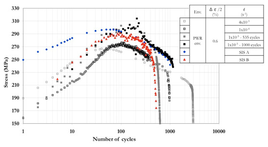 3.2. Influence of Strain Rate and/or Complex Loading on Cyclic Behavior and Fatigue Life in the PWR Environment
